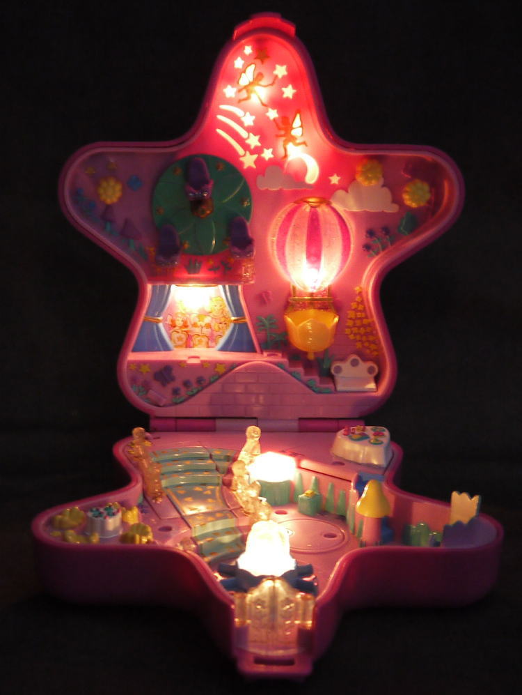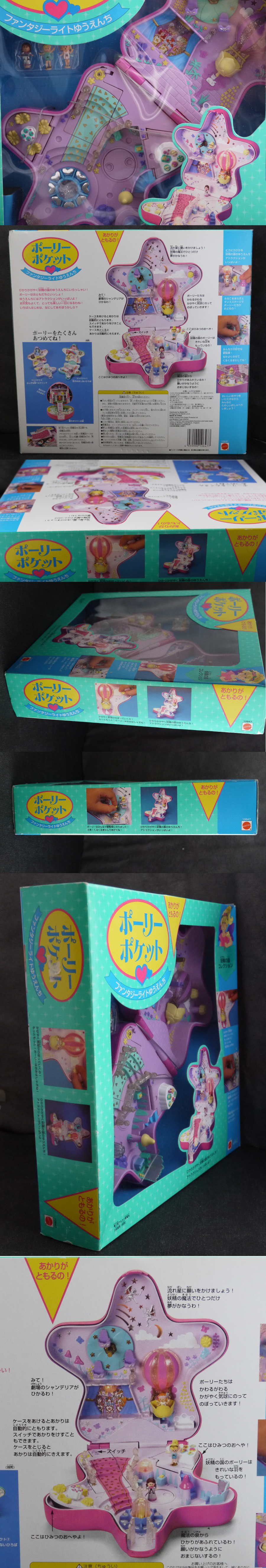 上:上は気球、回転遊技。観覧車、ショーのステージ 下:噴水、ダンス広場 仕掛け:フタを開けると自動的に明かりが点きます。気球の横の黄色いツマミを回すと気球が上下します。観覧車が回ります。下の黄色いツマミを回すとダンス広場が回転します。秘密の隠し部屋が2カ所付いています。 大きさ:横幅約19cm。人形は3体。