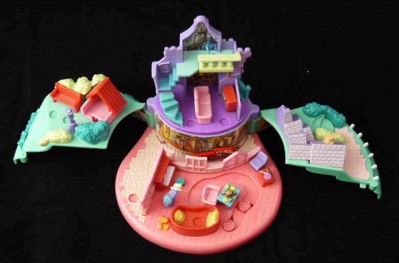 ◯閉じた状態は丘の上にあるクルエラの家です。 ○両側に開きます。開くと上はクルエラの家、、下は部屋をはさんで向こうは庭と道路、街の中です。 ○家の上の部分が回転し、家の中に変わります。後ろのレバーで車が動きます。帽子掛けを回すと人形が動かせます。 ◯人形はクルエラとイヌが6体(ポンゴ、パーディタ、ラッキー、その他)とリムジンです。 ○大きさは11.5cm×10cm×8cmです。