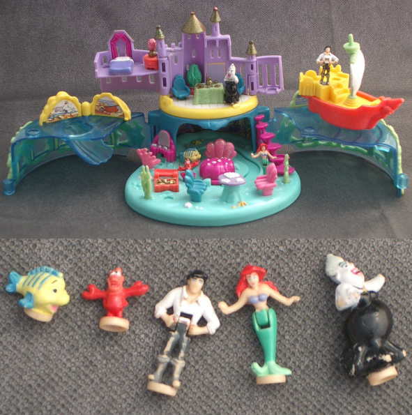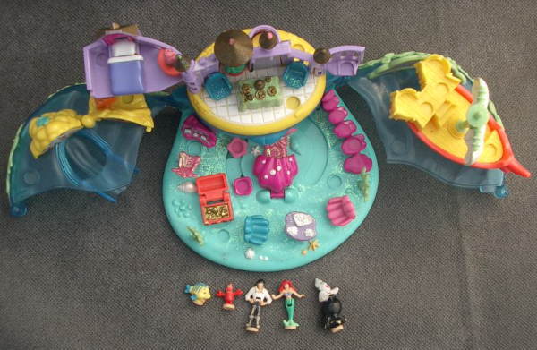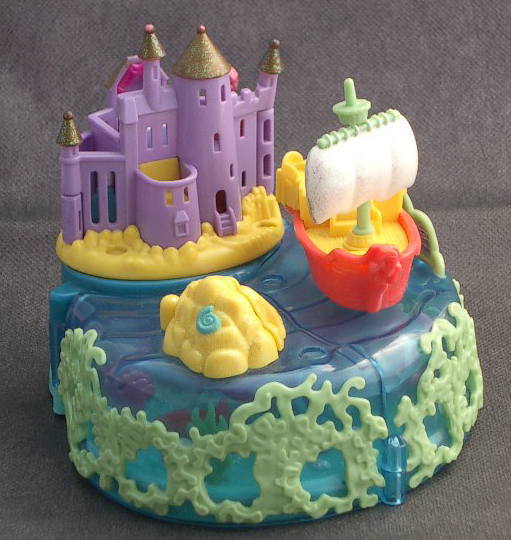 海を見下ろす丘の上にエリックのお城があります。海の上にエリックの船があります。 ○ケースの下の部分が両側に開きます。開くと上は海の上、、下は海の底です。またお城も広がります。宝の箱が開きます。 ○城の部分が回転し、城の中に変わります。紫のサンゴを回すと人形が動かせます。ピンクの貝をあけるとアリエルのベットが出てきます。等いろいろな仕掛けがあります。 ○大きさは約11.5cm×10cm×8cmです。