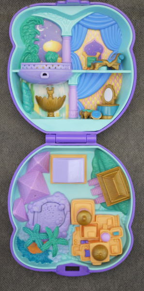 上:宮殿の中の様子、バルコニー、ソファー、鏡台などがあります。バルコニーに魔法の絨毯を取り付けることが出来ます。 下:アグラバーの上空からの景色です 仕掛け:下の建物の屋根を回すと塔もくるくる回転します。砂漠を開くと泉とジニーが出てきます 大きさ:横幅約10cm。