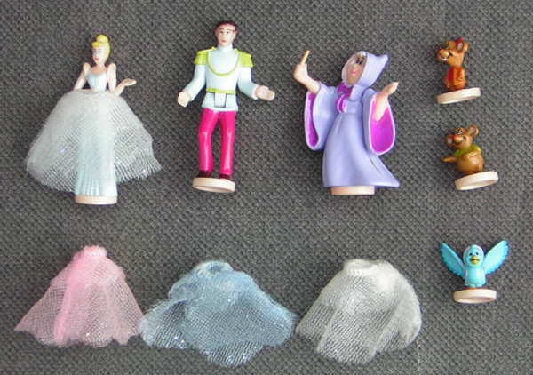 ◯人形はシンデレラ、王子様、妖精のおばあさん、、ネズミ2匹、青い鳥が2羽、その他付属品がドアの鍵、ウエディングドレスなどです。