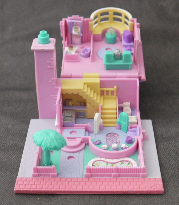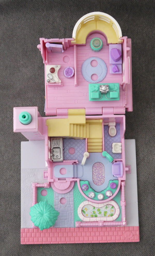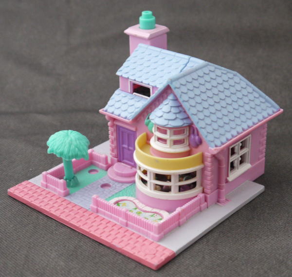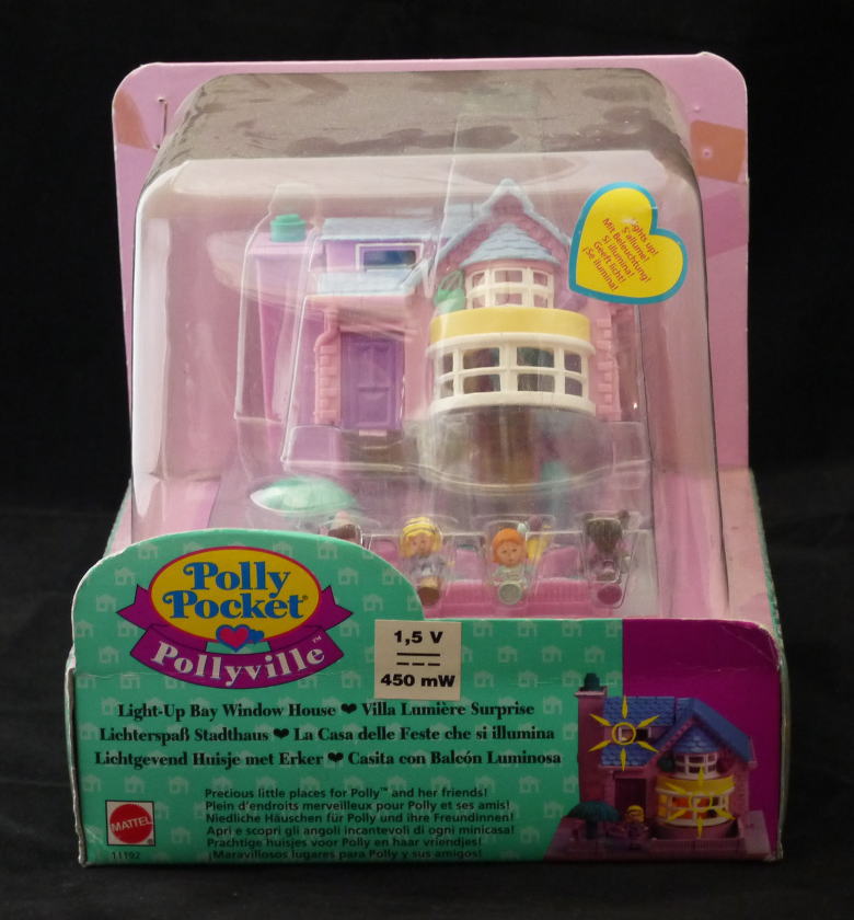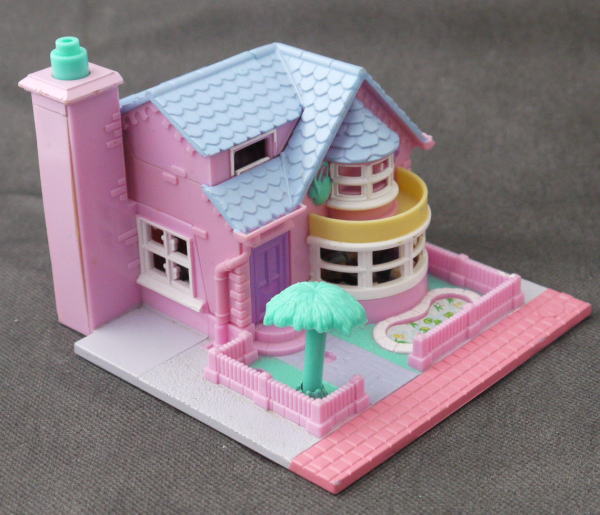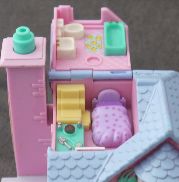上:上はテレビ、ステレオ、ドレッサー。最上階にも部屋があり、ベットとお風呂などあります。 下:玄関、キッチンとトイレ 仕掛け:煙突の上を押すとライトアップします。トイレのドアが開きます。ドレッサーの鏡が開きます。 大きさ:横幅約11cm×高さ8.5cm×奥行11cm。