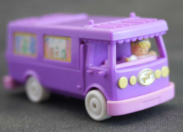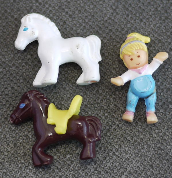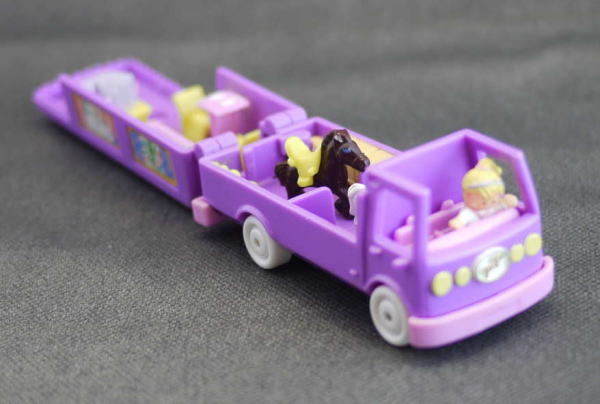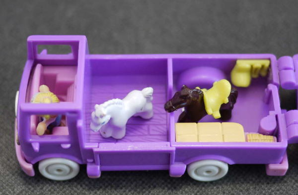 仕掛け:後ろのドアが開きます。タイヤが動きます。ポーリーは馬に乗る事が出来ます。