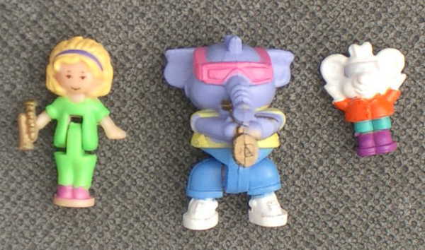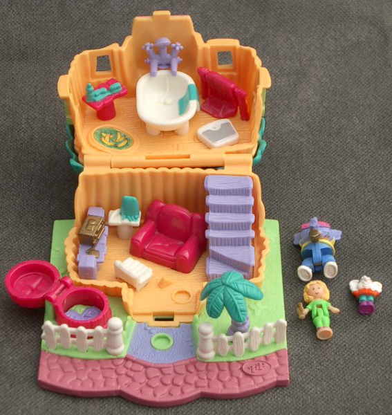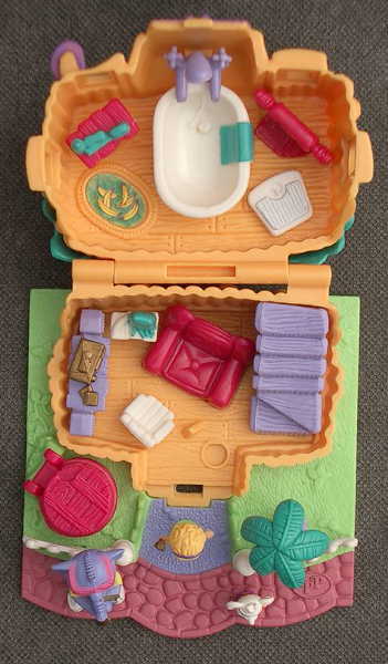 上:2階はお風呂で大きなバスタブが有ります。 下:1階は居間でピンクの大きなソファ、白の小さなソファ、テーブル、階段などがあります。庭にはヤシの木、クッションの入った赤い樽がなどがあります。 仕掛け:入り口のドアが開きます。 大きさ:横幅約8cm