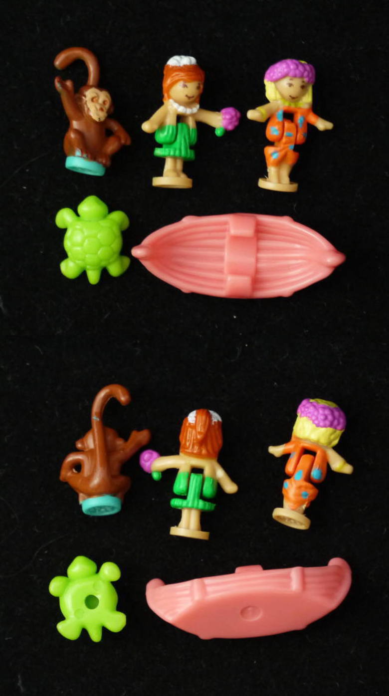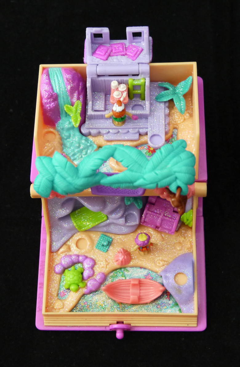 ポーリーポケット1995年キラキラアイランド。全体にラメが入ってきれいです。 ふたを閉じると可愛い絵本の形をしています。 上:バンガロー、椰子の木(上下に動きます。)に下がったハンモック、小川などがあります。 下:ビーチで宝の箱などです。 仕掛け: 仕掛け:宝箱のフタがあきます。 大きさ:8.5cm×7.5cm×4cmです。