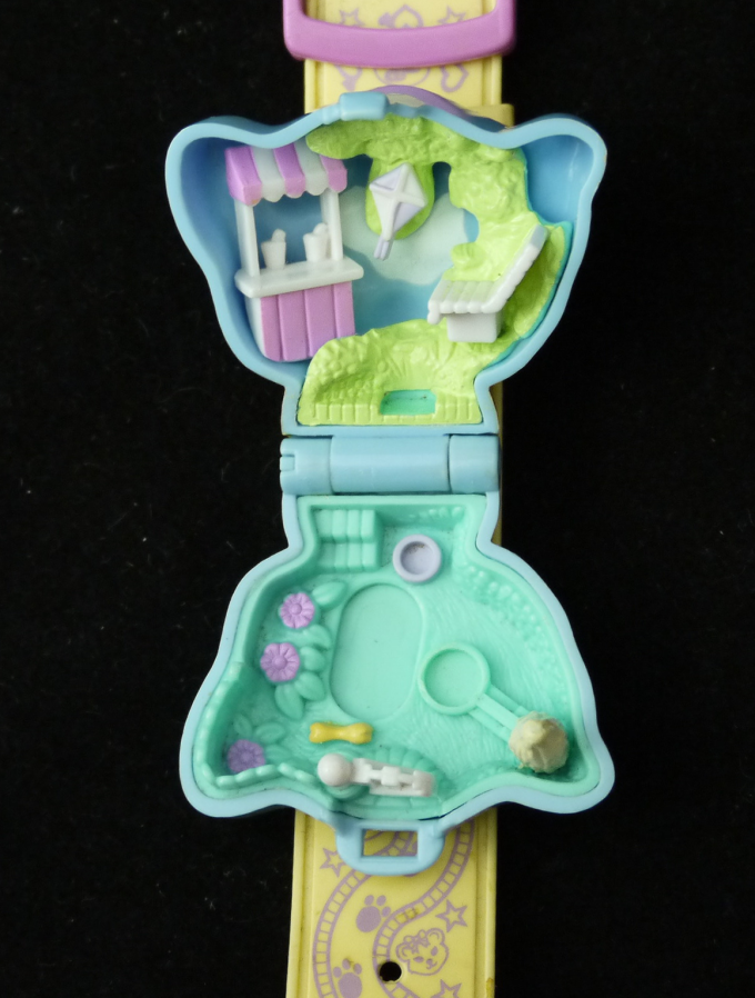 1995年製ペットコレクションシリーズ 子犬のブレスレットです。 ふたを開けると公園で遊ぶポーリーと子犬です。椅子などがあります。 出掛けるときもブレスレットとしてアクセサリーにも、また遊んだりすることも出来ます。 仕掛け:ポーリーがます。 大きさ:約4cm×5cm×2cmです。