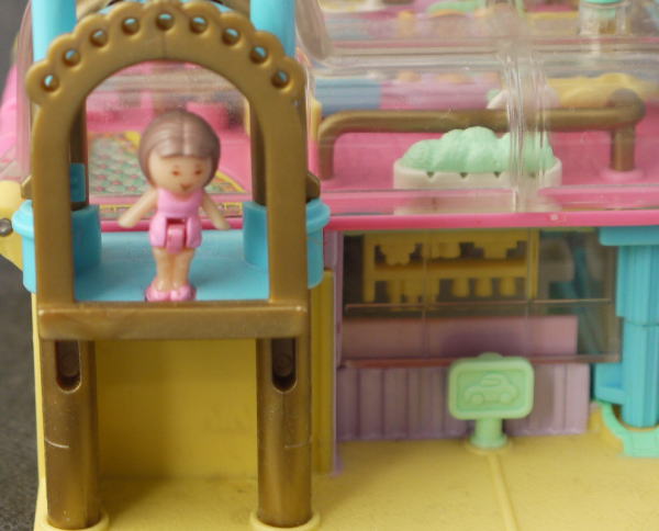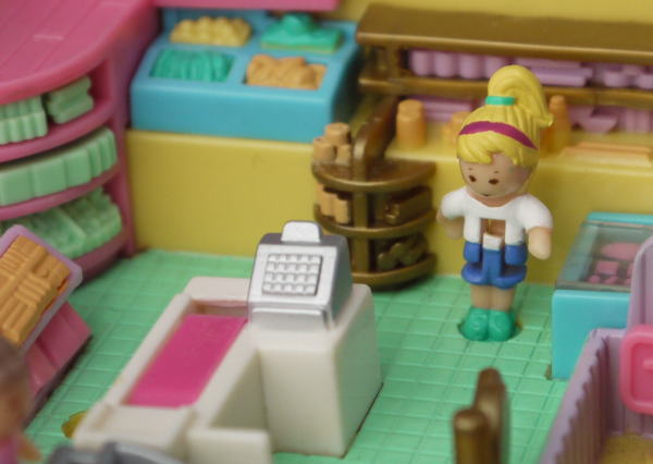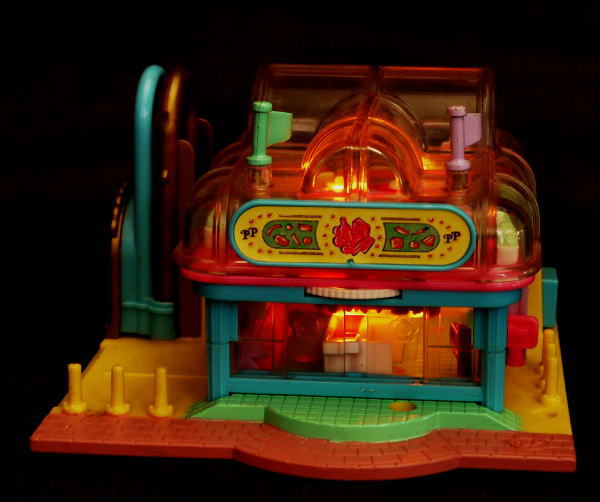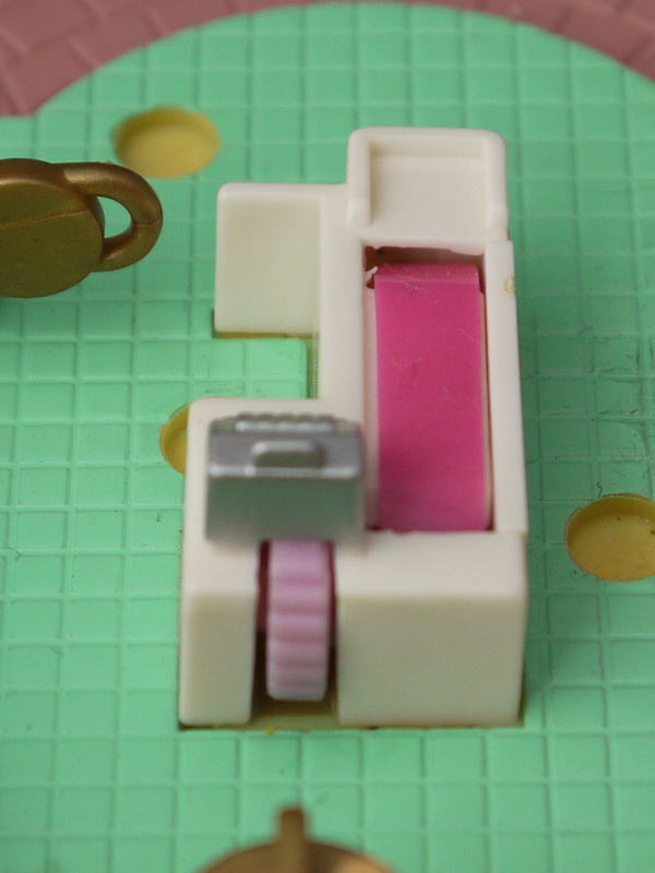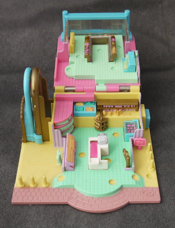 上:屋上はカフェでイスやテーブル乗り物など。2階はスーパーの食品売り場 下:売り場にレジ。 仕掛け:外のエレベーターが動きます。レジのカウンターが動きます。冷蔵庫のドアが開きます。ダイアルを回すとドアが開閉し上の乗り物が回転します。 大きさ:横幅約12cm×10cm×8cm。
