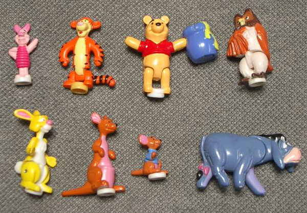 ◯人形ははプーさん、イーヨ、ピグレット、ティガー、オウル、カンガとルーラビット。プーさんの手にマグネットで青いハニーポットが付きます。