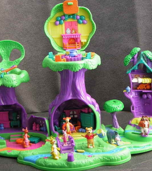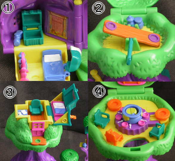 ◯①左のツリーハウスの中、ベットが開き箱のふたが開きます。②その木の上にシーソーがあります。③まん中のツリーハウスの上に家の屋根が開きます。④その下のテーブルのまん中にハニーポットを置き右を押すとハニーポットが出てきます。⑤橋の上にプーさんを置き、手前の切り株を回すと人形と川の木が動きます。⑥まん中のツリーハウスの下にプーさんを置き後ろのレバーを動かすとプーさんが動き戸棚のドアが開きます。⑦右のツリーハウスの下に人形を置き後ろのレバーを動かすと人形が動きます。⑧その横の輪が動きます。などたくさんの仕掛けがあります。他にどんな仕掛けがあるか探してください。